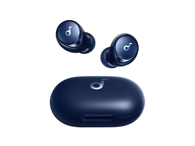 Anker Soundcore earbuds in navy blue on a yellow background.