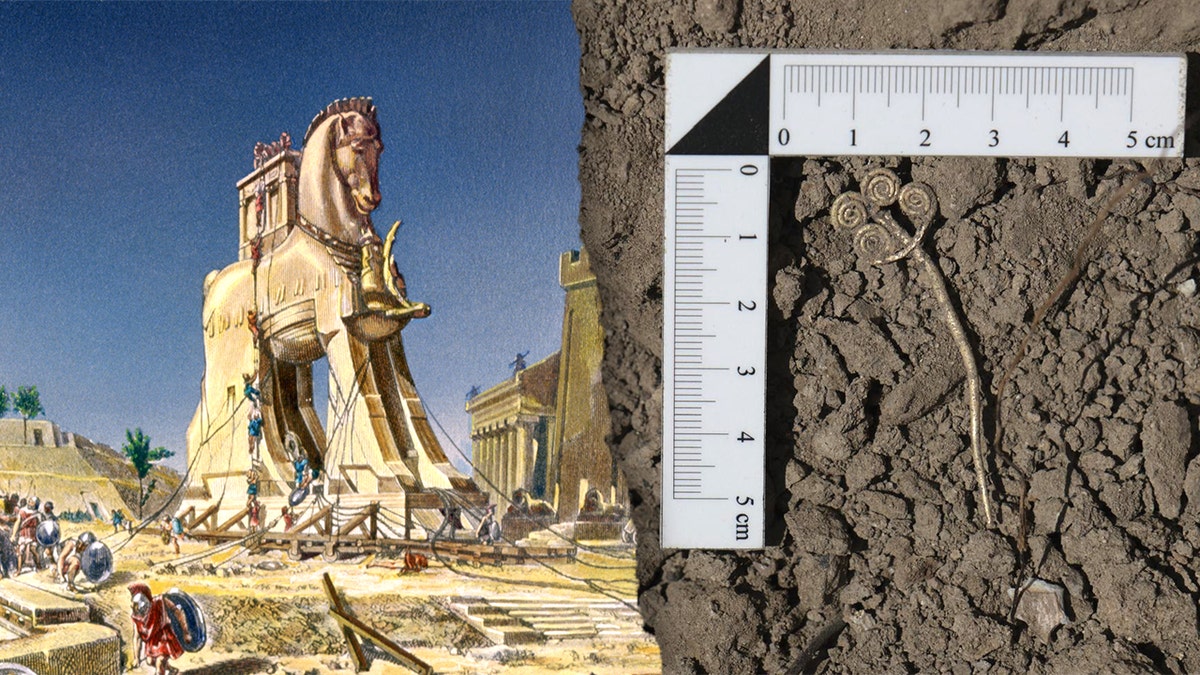 Archaeologists in northwestern Turkey uncovered a golden brooch and rare jade stone in the remains of the ancient city of Troy. (Bettman via Getty Images; @MehmetNuriErsoy via X)