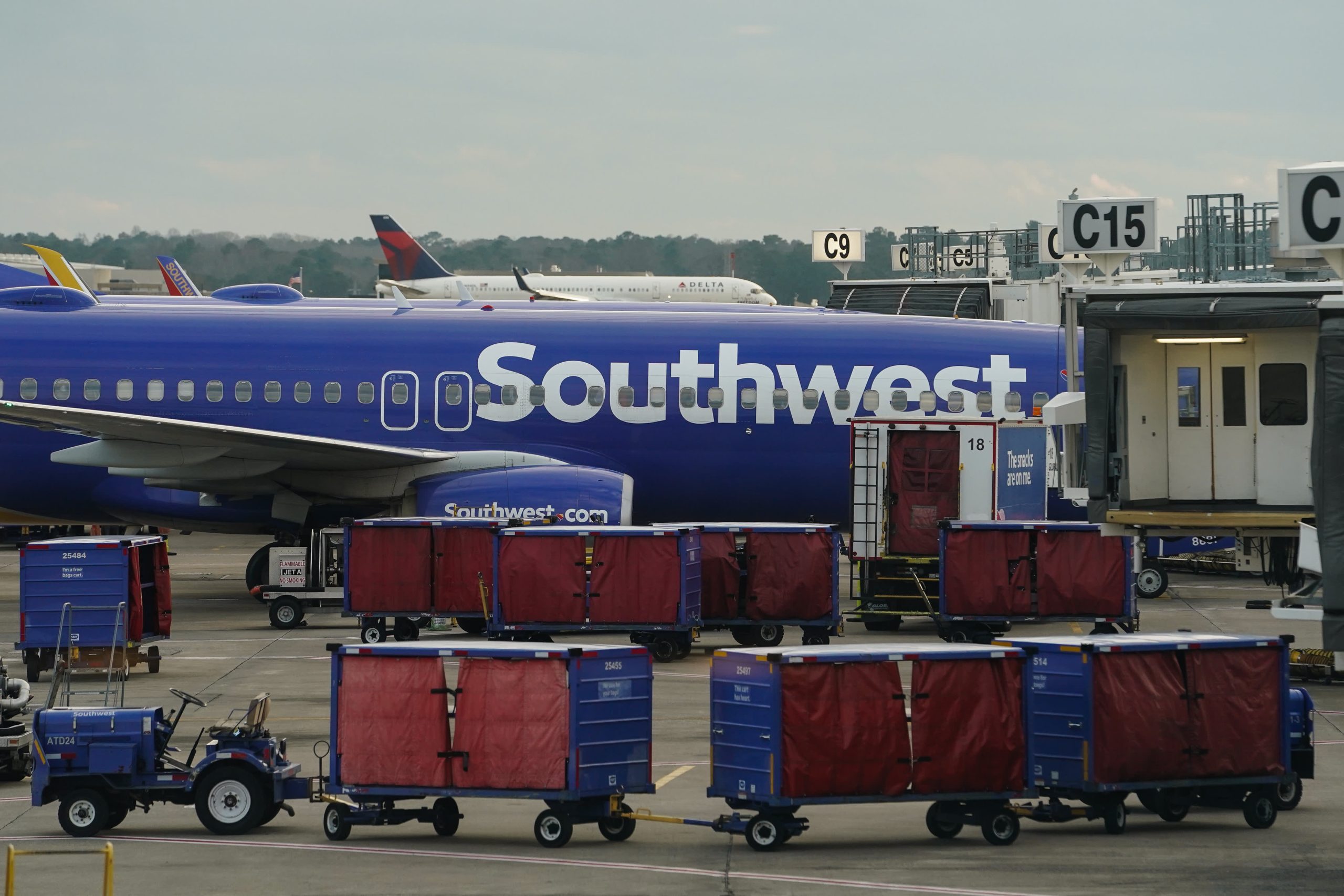 A Southwest plane and baggage carts at Hartsfield-Jackson Atlanta International Airport (ATL) in Atlanta, Georgia, U.S., on Monday, Dec. 27, 2021.